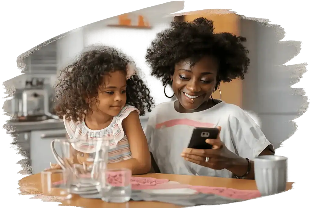 mum looking for a loan on her phone and her daughter is sitting next to her